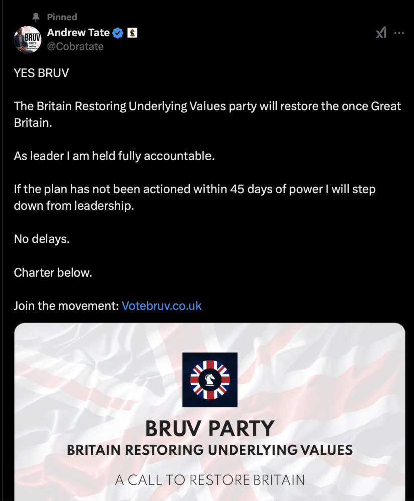 Miliardár Andrew Tate oznámil vznik politickej strany BRUV (Britain Restoring Underlying Values), ktorá má obnoviť slávu Spojeného kráľovstva. Sľubuje rýchle činy a zodpovednosť, pričom rezignuje, ak plán do 45 dní nesplní.